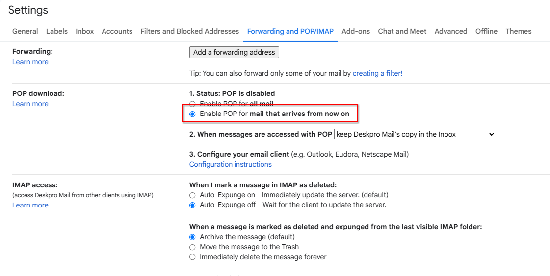 Gmail has a setting which allows you to limit POP3 to only mail which arrives from now on, meaning older emails Deskpro has already processed should not be re-processed. We recommend enabling this option when enabling POP3 on your Gmail account.