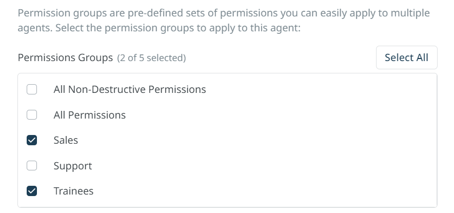 To save time applying permissions to agents, you can create permission groups which will grant permissions to multiple agents at once. A permission group stores a set of permissions, and when you add an agent to the group, the agent is granted all those permissions. You can add an agent to more than one permission group.