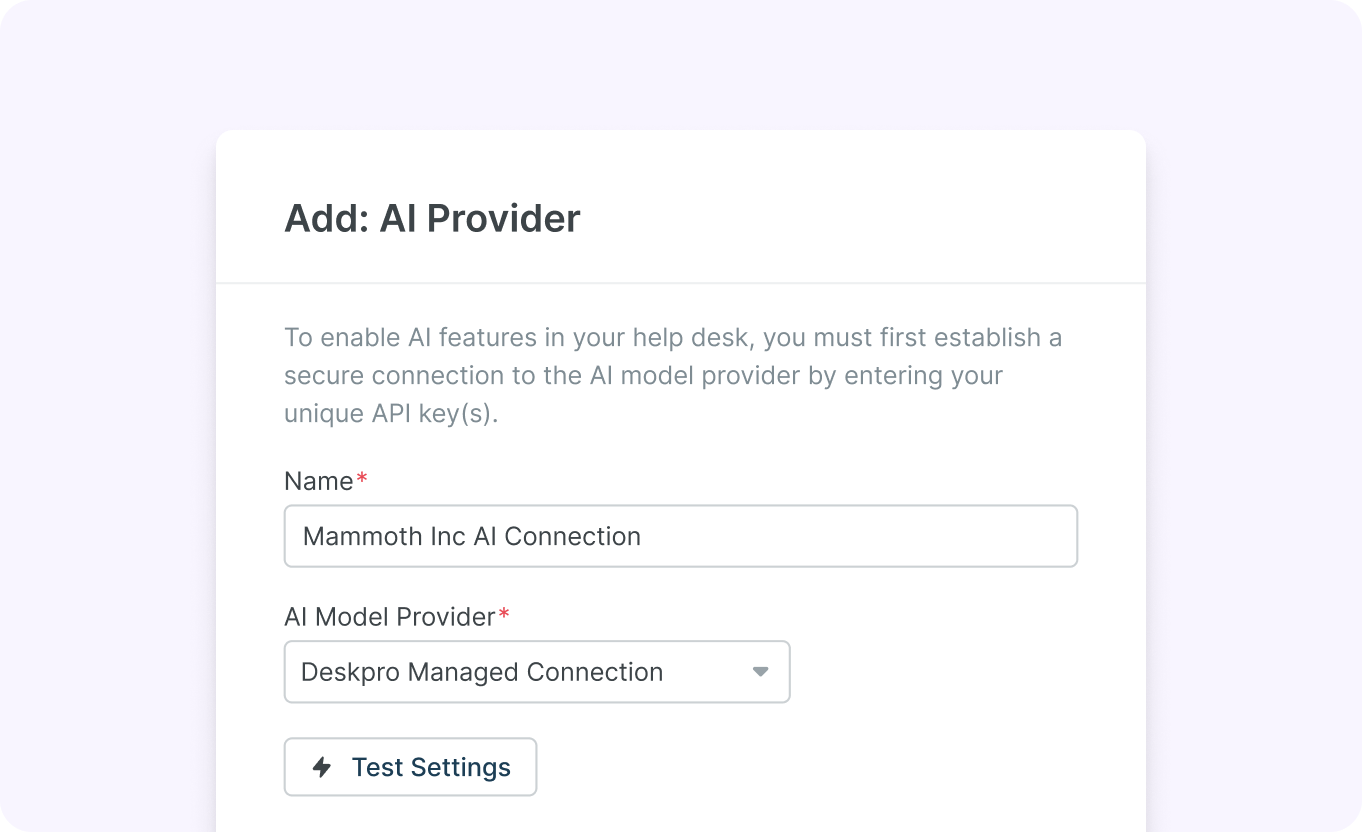 The Deskpro Managed Connection is a seamless and secure way to access OpenAI's powerful AI capabilities within Deskpro, without the complexity of managing separate OpenAI or Azure AI accounts. We handle the technical complexities, so you can focus on what matters most: providing exceptional support.